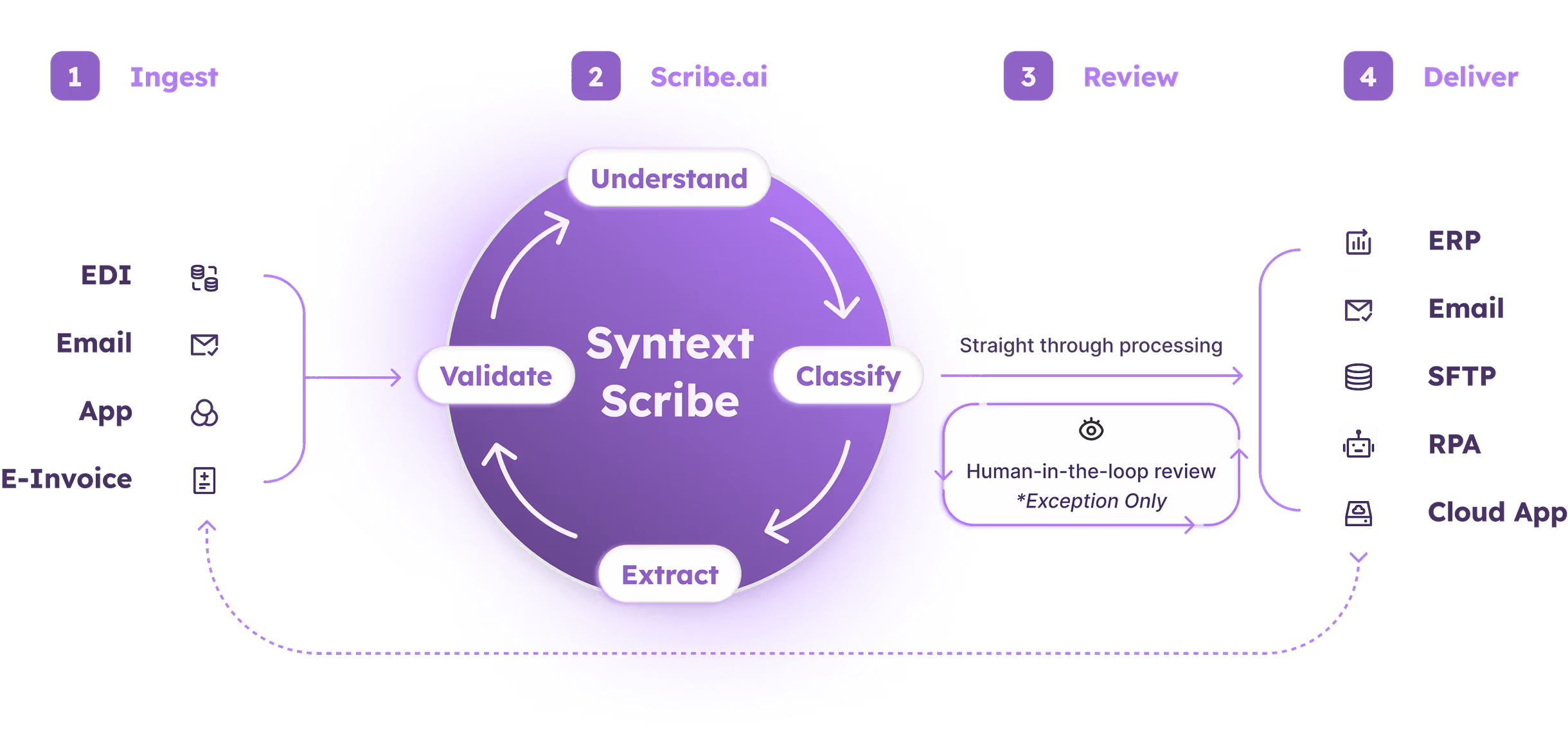 Syntext Scribe classifies document types across any ingestion channel (E-Mail, SFTP, EDI, E-Invoice Platform) and routes your documents accordingly.